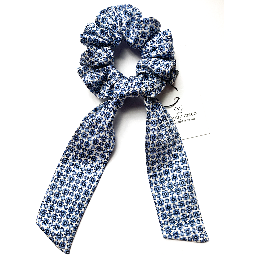In such a masterpiece limited edition series, the dahl sunset silk scrunchie is quite the perfect accessory to flourish into the fall season with. Not only does it incorporate the soft and silky elements of a 100% natural silk material, but it is extremely breathable. On this accessory are spiral blue flowers that embellish a subtle and bright white base. As a signature part of the silk scrunchies collection, the dahl sunset silk scrunchie includes a detachable bow that can be tied on to any accessory or used as a neckerchief, bracelet, or anklet.